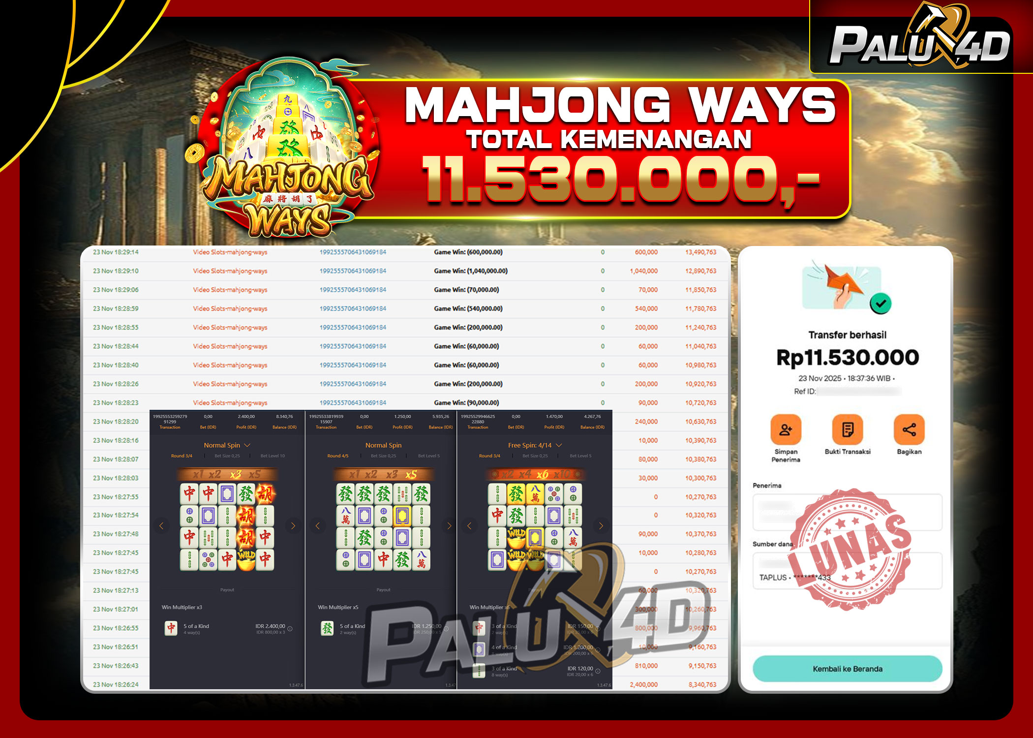 PALU4D – Menang Slot MAHJONG WAYS   Rp.11.530.000.,- LUNAS