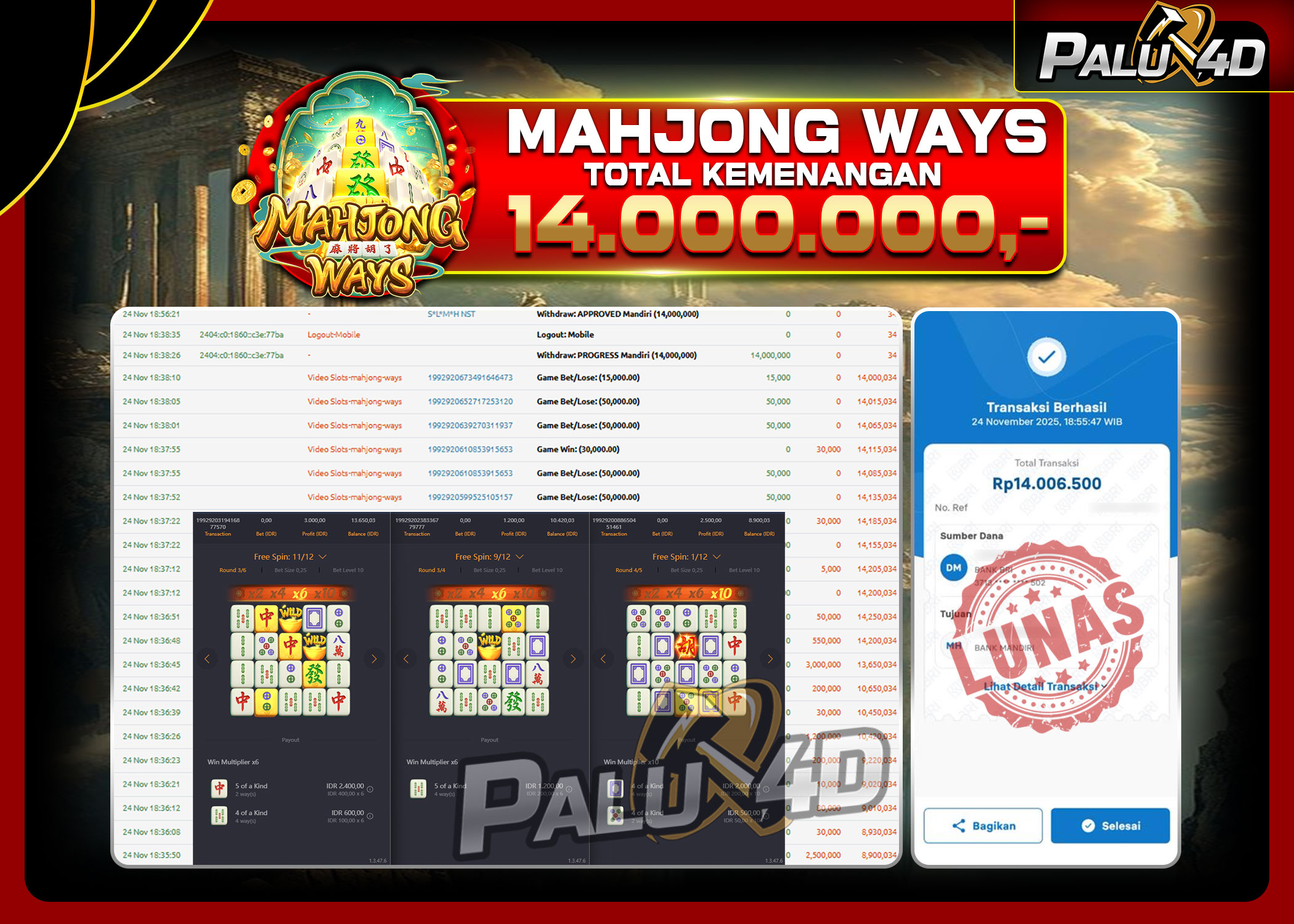 PALU4D – Menang Slot MAHJONG WAYS   Rp.14.000.000.,- LUNAS