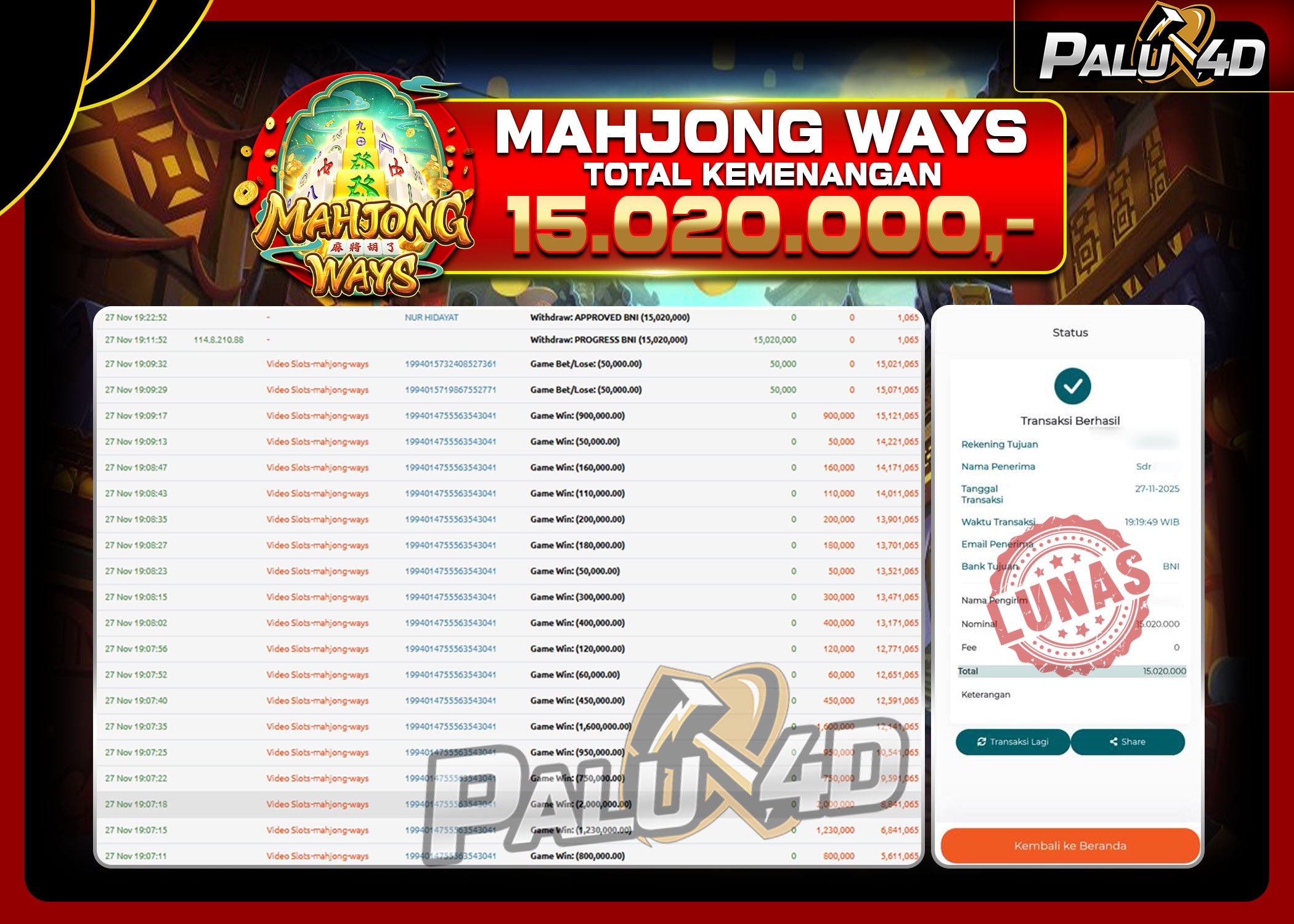 • PALU4D – Menang Slot MAHJONG WAYS   Rp.15.020.000.,- LUNAS