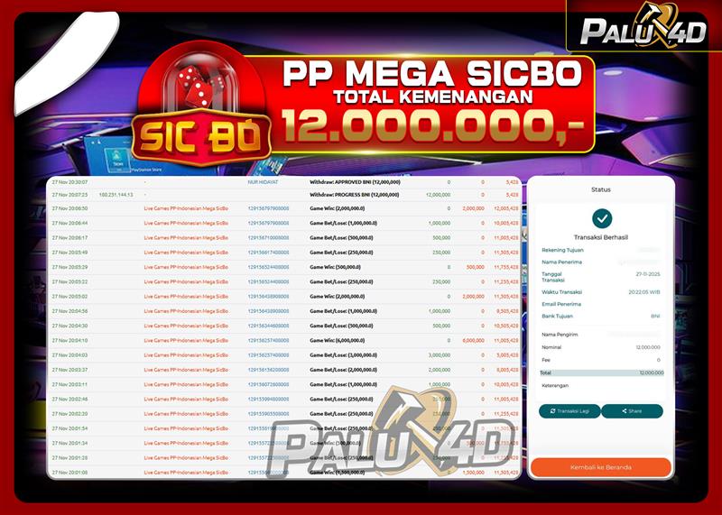 PALU4D – Menang Live Games MEGA SICBO Rp 12.000.000.,- LUNAS