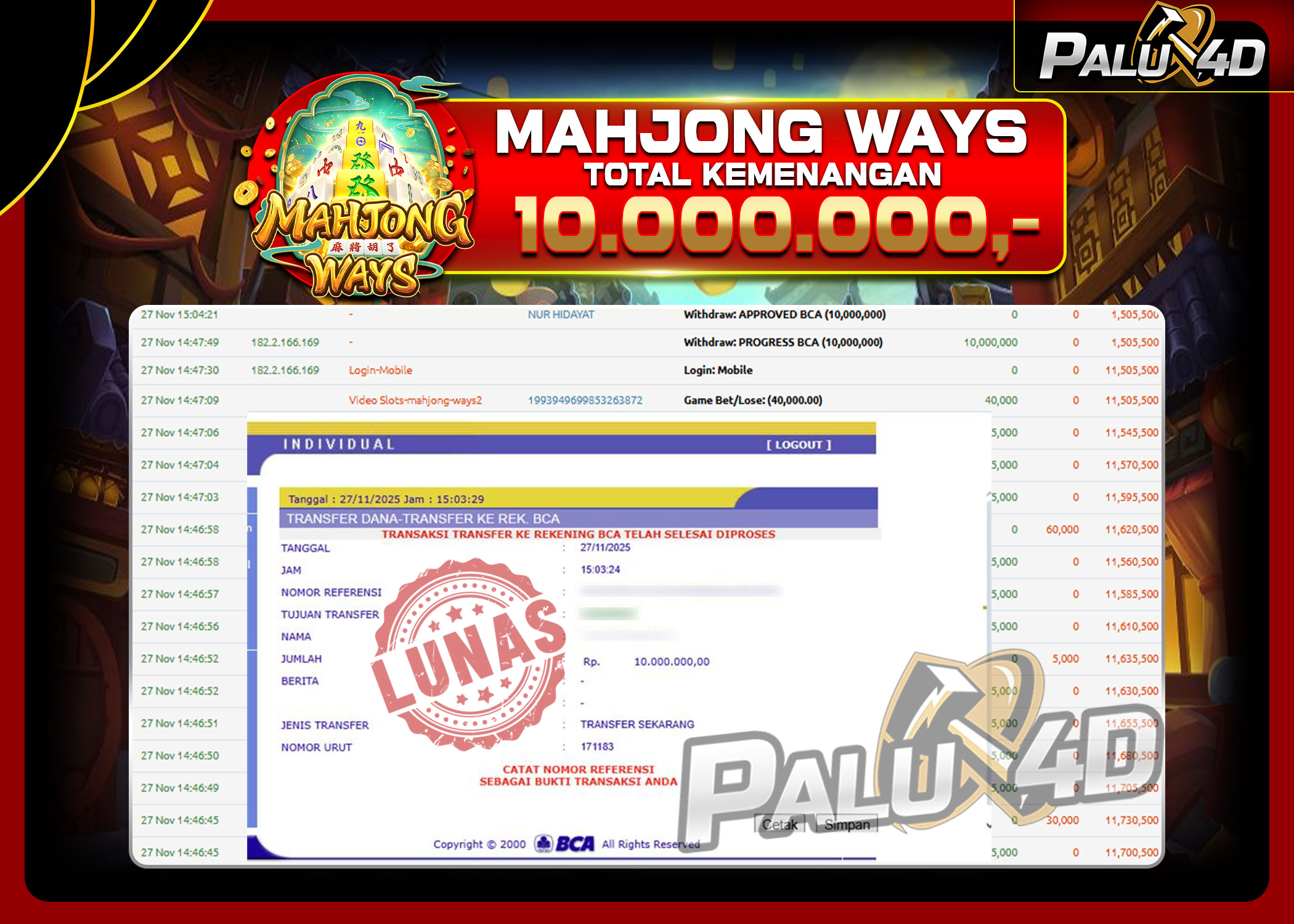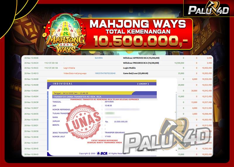 PALU4D – Menang Slot MAHJONG WAYS   Rp.10.000.000.,- LUNAS