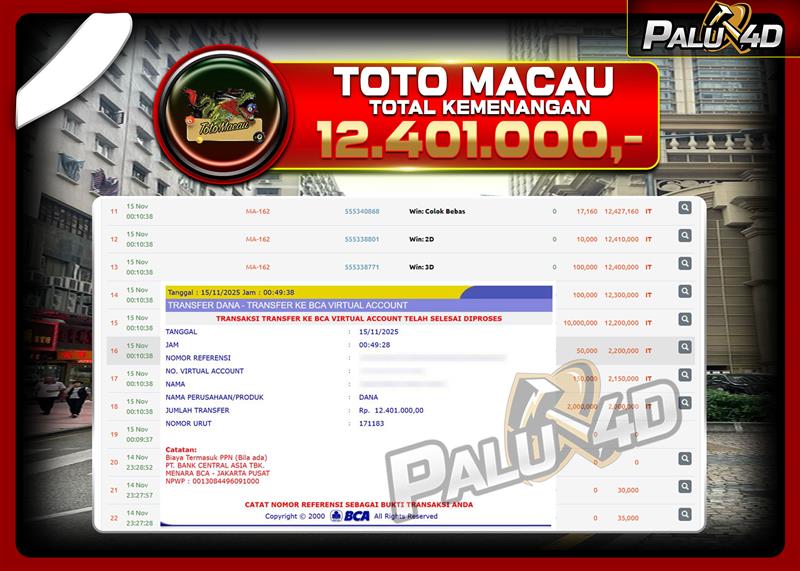 PALU4D – Menang Togel TOTOMACAU Rp.11.000.000.,- LUNAS PALU4D – Selamat bagi pemenang yang mendapatkan jackpot hari ini 21 NOVEMBER 2025 di game Togel […]