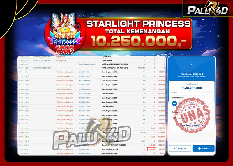PALU4D – Menang Slot STARLIGHT PRINCES 1000  Rp.10.250.000.,- LUNAS