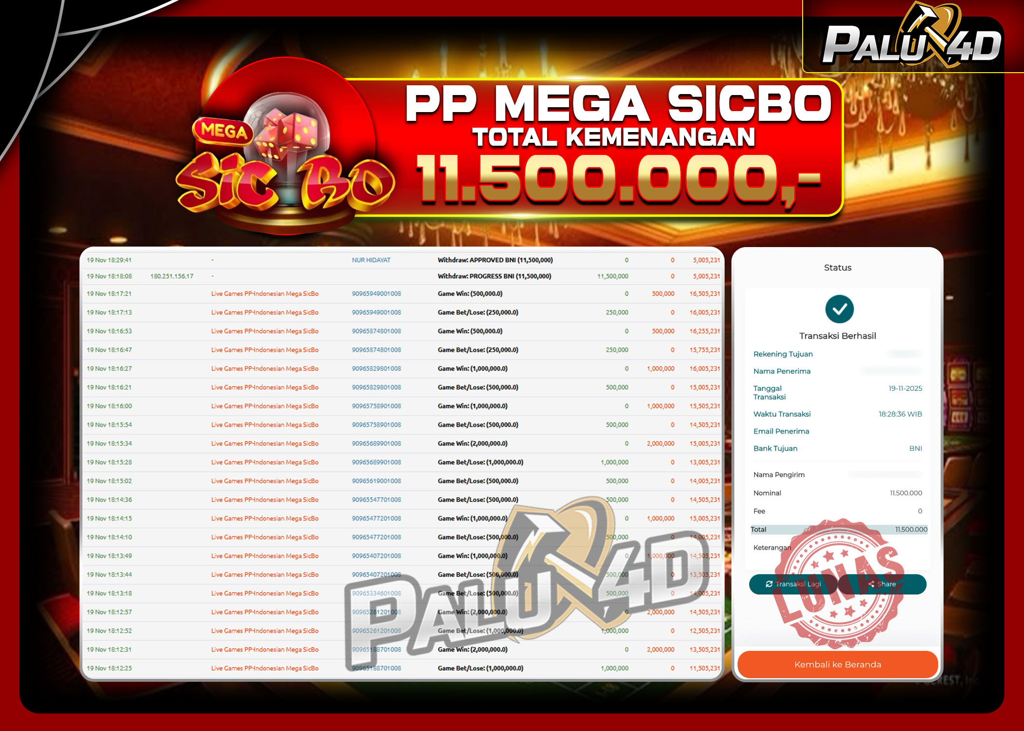 PALU4D – Menang Live Games MEGA SICBO Rp 11.500.000.,- LUNAS