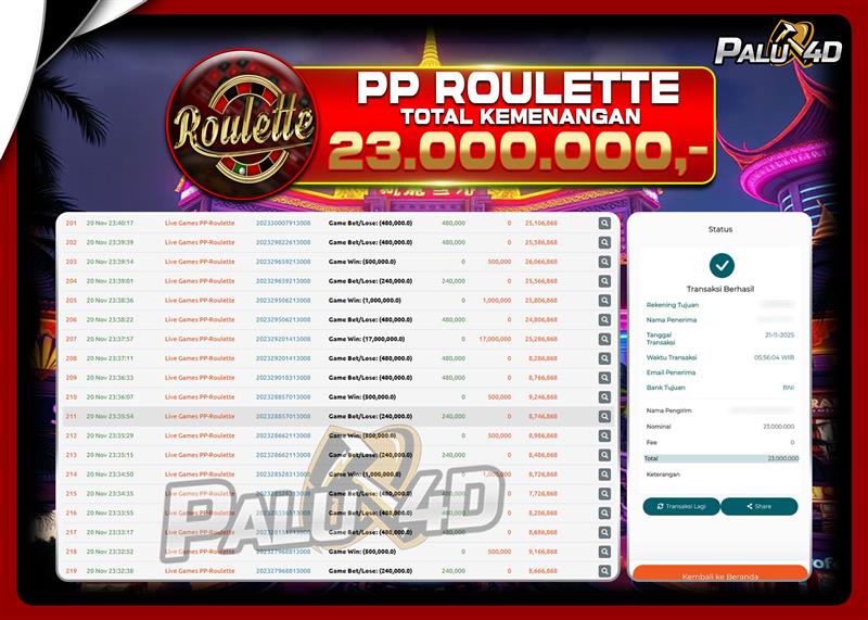 PALU4D – Menang LIVE CASINO MEGA ROULETTE   Rp.23.000.000.,- LUNAS