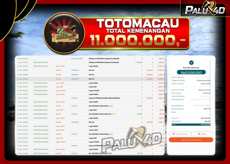 PALU4D – Menang Togel TOTOMACAU Rp.11.000.000.,- LUNAS PALU4D – Selamat bagi pemenang yang mendapatkan jackpot hari ini 21 NOVEMBER 2025 di game Togel […]