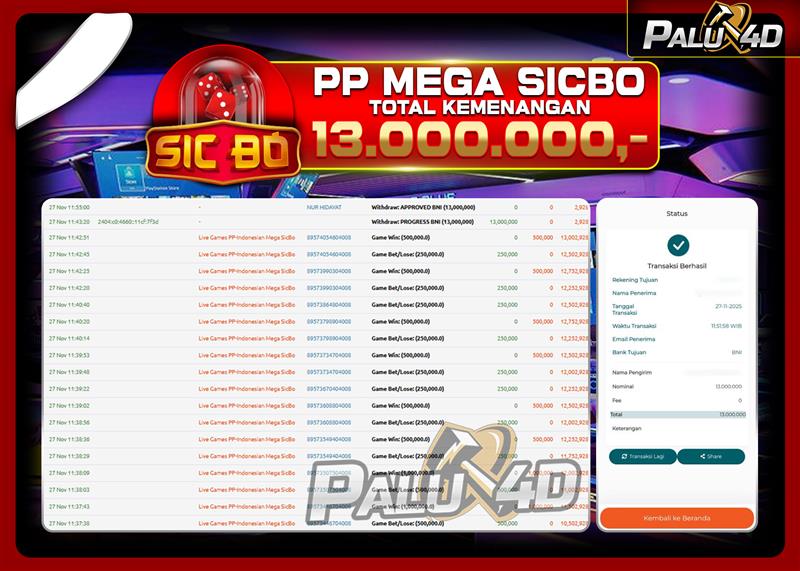 PALU4D – Menang Live Games MEGA SICBO Rp 13.000.000.,- LUNAS