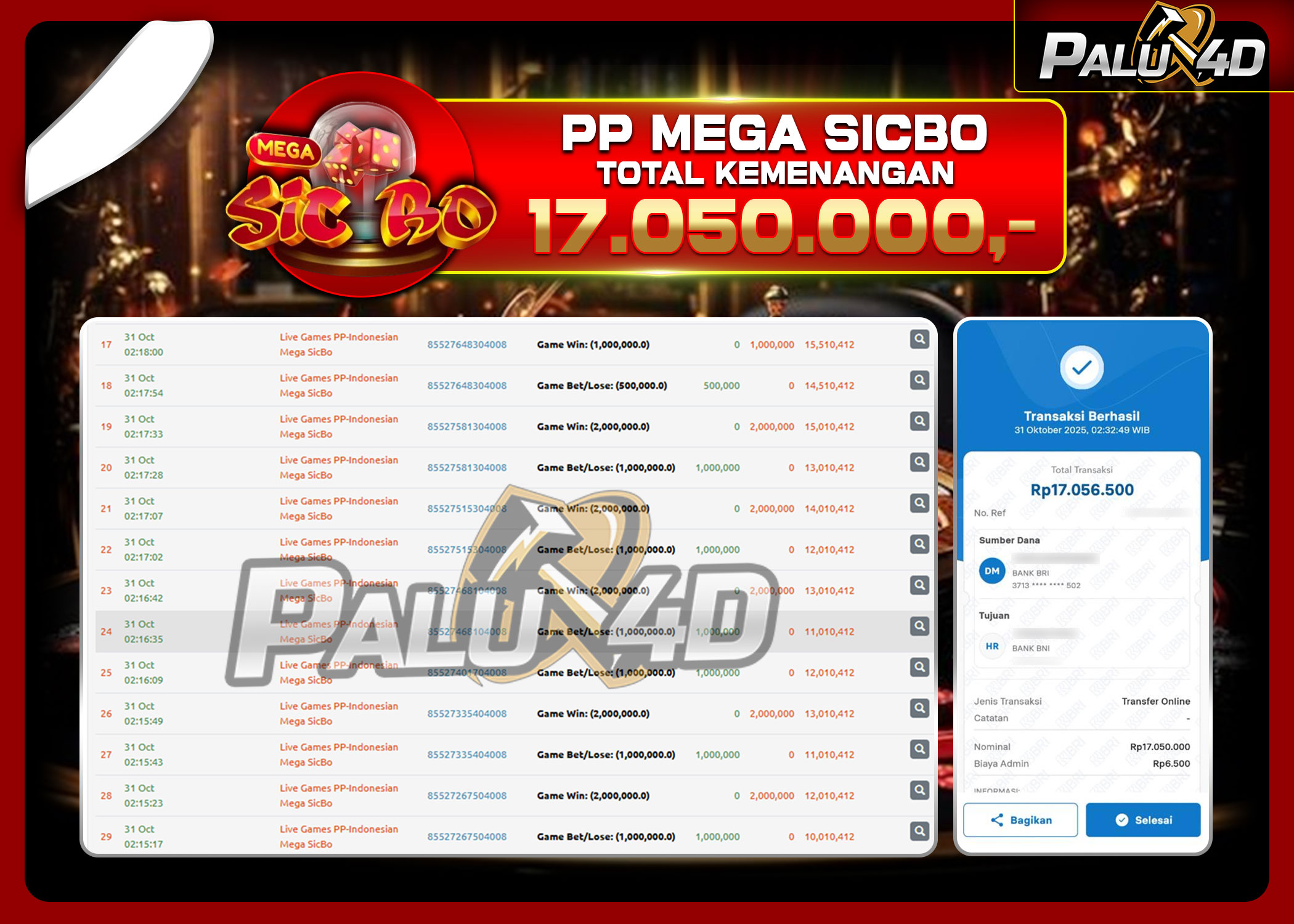 PALU4D – Menang Live Games MEGA SICBO Rp 17.050.000.,- LUNAS