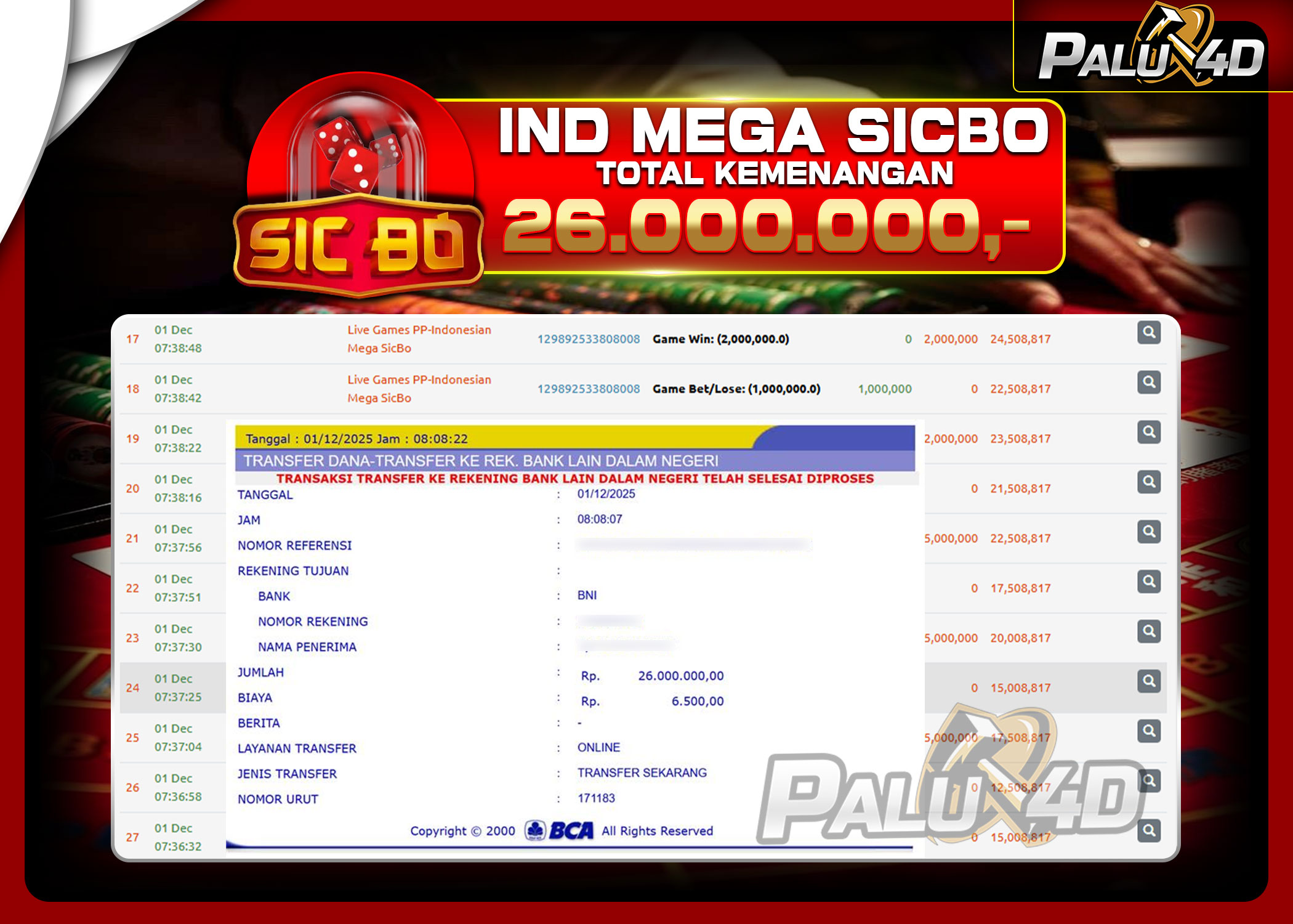 PALU4D – Menang Live Games MEGA SICBO Rp 26.000.000.,- LUNAS