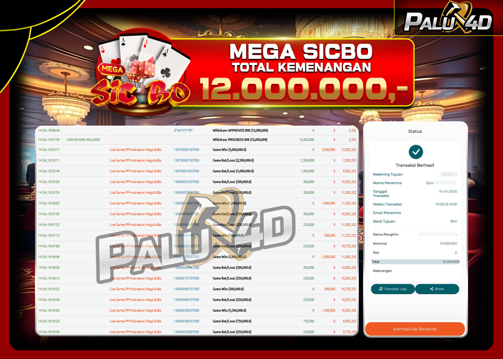 PALU4D – Selamat bagi pemenang yang mendapatkan jackpot hari ini 14 Oktober 2025 di game Live Games MEGA SICBO  yang di sediakan situs palu4d dan sudah kami bayar lunas. Berikut data pemenang hari ini yang kami proses dengan cepat ke rekening tujuan yang terdaftar di akun selama ±10 menit.