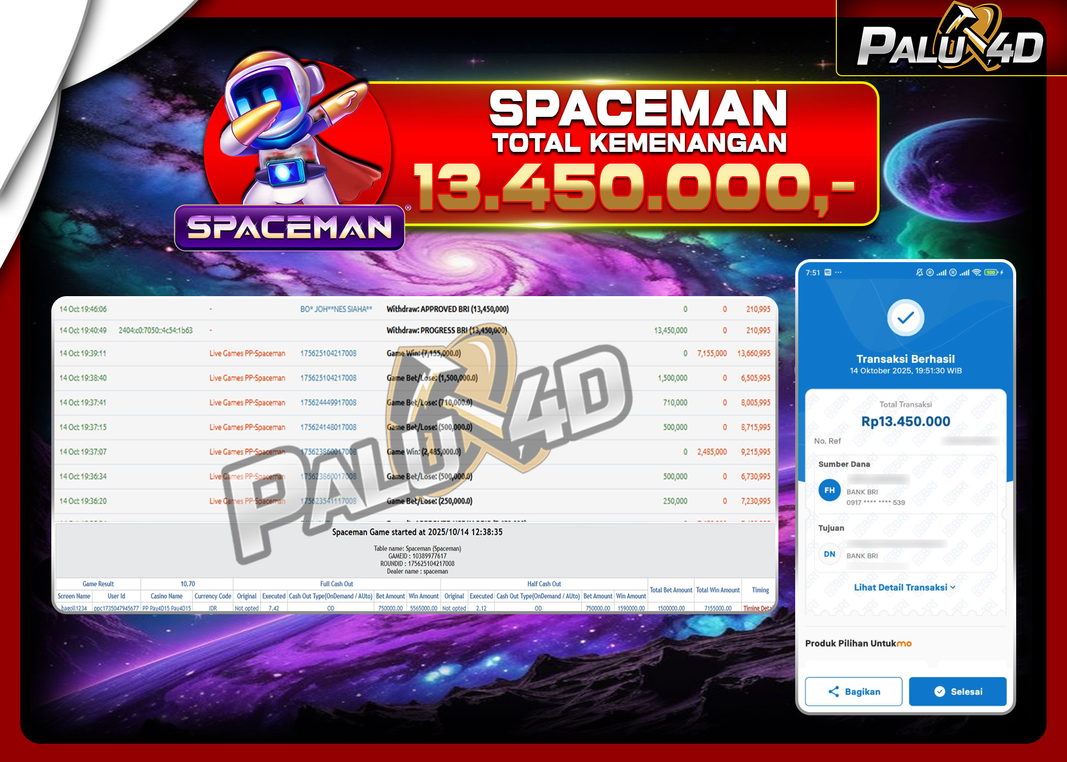 PALU4D – Selamat bagi pemenang yang mendapatkan jackpot hari ini 24 Oktober 2025 di game Live Games SPACEMAN yang di sediakan situs palu4d dan sudah kami bayar lunas. Berikut data pemenang hari ini yang kami proses dengan cepat ke rekening tujuan yang terdaftar di akun selama ±10 menit.