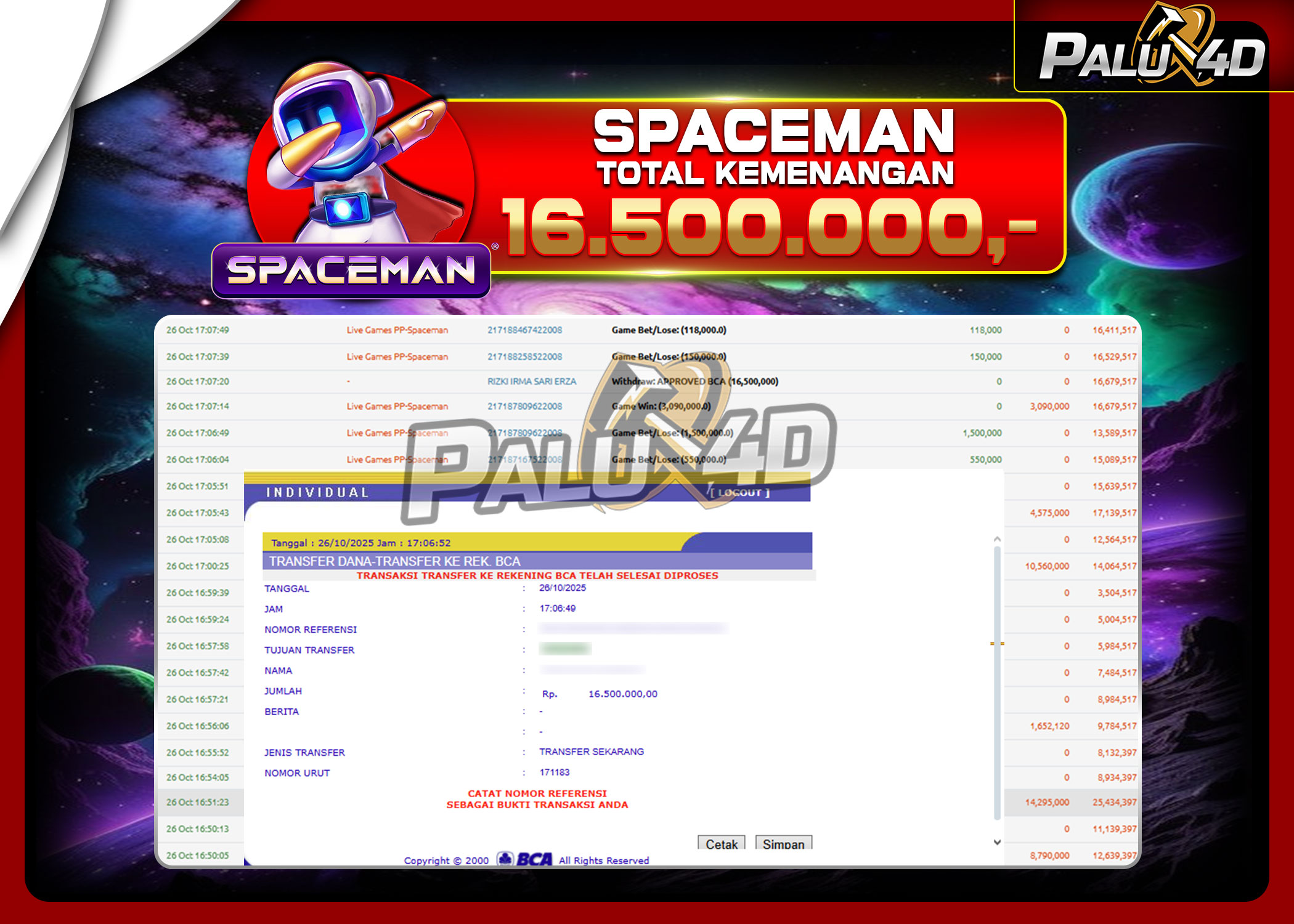 PALU4D – Selamat bagi pemenang yang mendapatkan jackpot hari ini 26 Oktober 2025 di game Live Games SPACEMAN yang di sediakan situs palu4d dan sudah kami bayar lunas. Berikut data pemenang hari ini yang kami proses dengan cepat ke rekening tujuan yang terdaftar di akun selama ±10 menit.