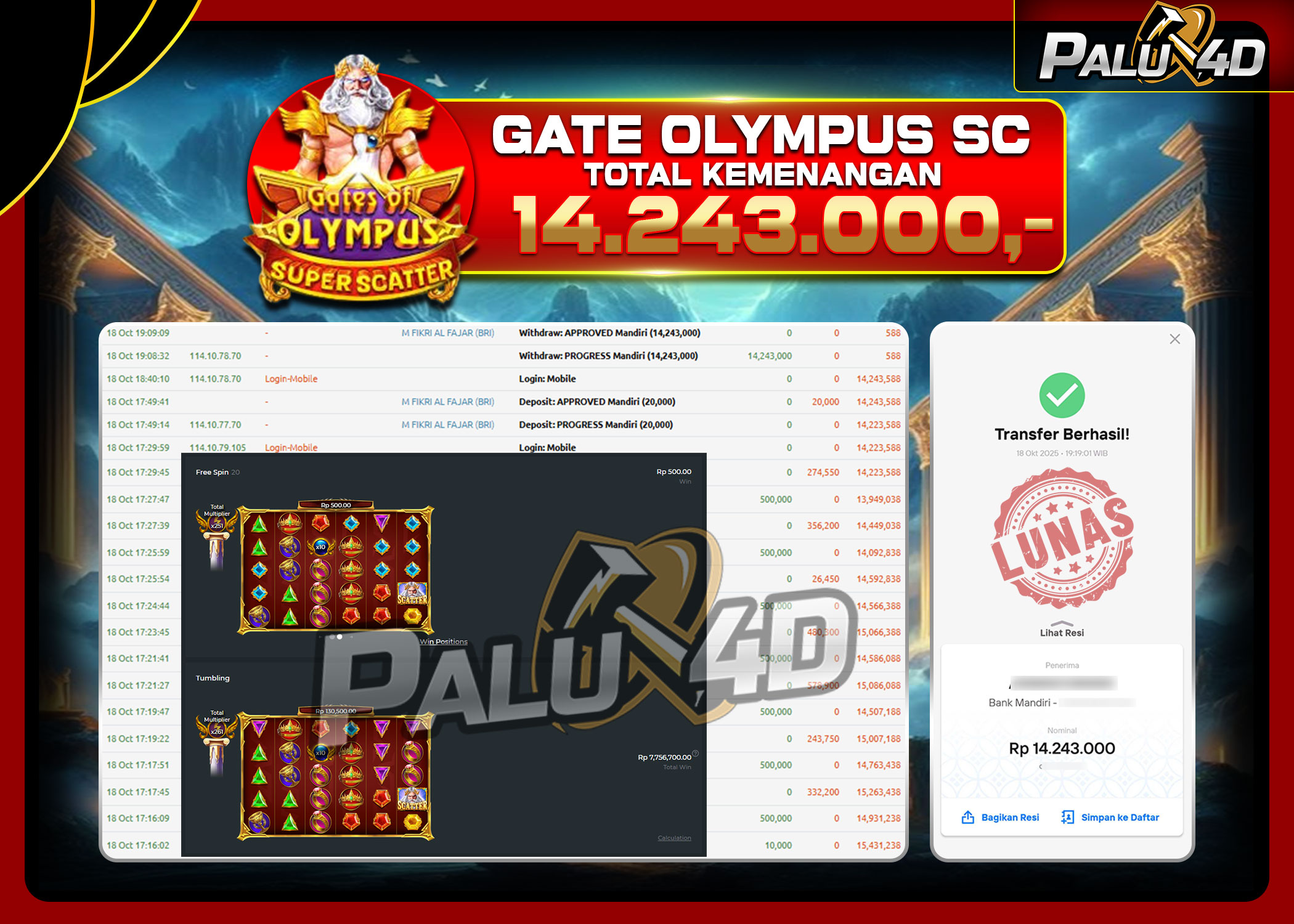 PALU4D – Selamat bagi pemenang yang mendapatkan jackpot hari ini 18 Oktober 2025 di game Slot GATES OF OLYMPUS SUPER SCATTER yang di sediakan situs palu4d dan sudah kami bayar lunas. Berikut data pemenang hari ini yang kami proses dengan cepat ke rekening tujuan yang terdaftar di akun selama ±10 menit.