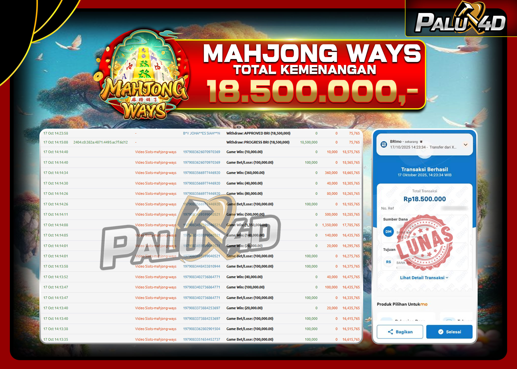 PALU4D – Selamat bagi pemenang yang mendapatkan jackpot hari ini 17 Oktober 2025 di game Slot MAHJONG WAYS 2 yang di sediakan situs palu4d dan sudah kami bayar lunas. Berikut data pemenang hari ini yang kami proses dengan cepat ke rekening tujuan yang terdaftar di akun selama ±10 menit.