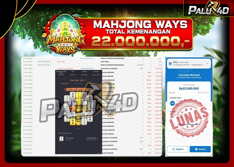PALU4D – Selamat bagi pemenang yang mendapatkan jackpot hari ini 21 Oktober 2025 di game Slot MAHJONG WAYS 2 yang di sediakan situs palu4d dan sudah kami bayar lunas. Berikut data pemenang hari ini yang kami proses dengan cepat ke rekening tujuan yang terdaftar di akun selama ±10 menit.
