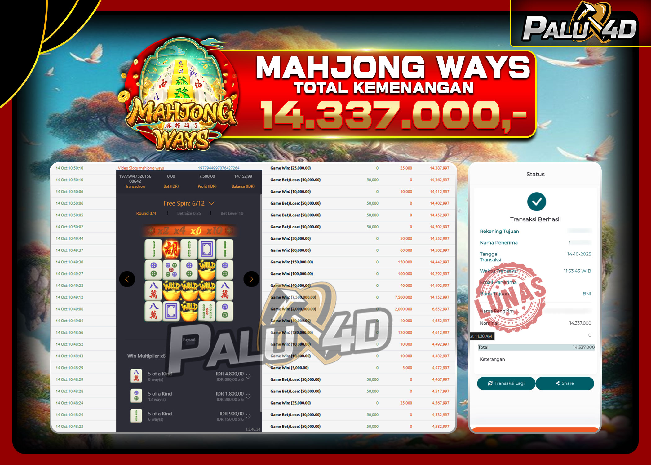 PALU4D – Selamat bagi pemenang yang mendapatkan jackpot hari ini 14 Oktober 2025 di game Slot MAHJONG WAYS yang di sediakan situs palu4d dan sudah kami bayar lunas. Berikut data pemenang hari ini yang kami proses dengan cepat ke rekening tujuan yang terdaftar di akun selama ±10 menit.