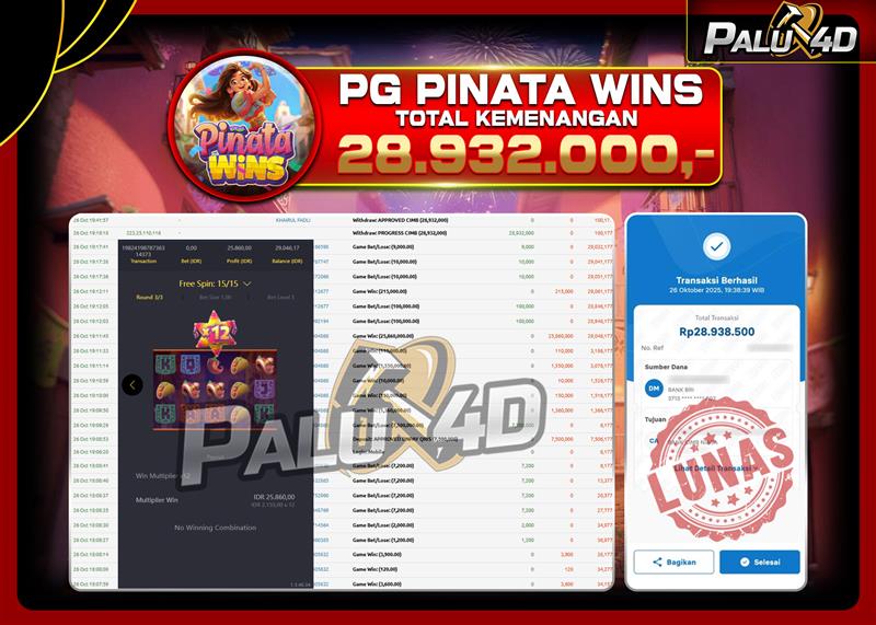 PALU4D – Selamat bagi pemenang yang mendapatkan jackpot hari ini 26 OKTOBER 2025 di game Slot PINATA WINS yang di sediakan situs palu4d dan sudah kami bayar lunas. Berikut data pemenang hari ini yang kami proses dengan cepat ke rekening tujuan yang terdaftar di akun selama ±10 menit.