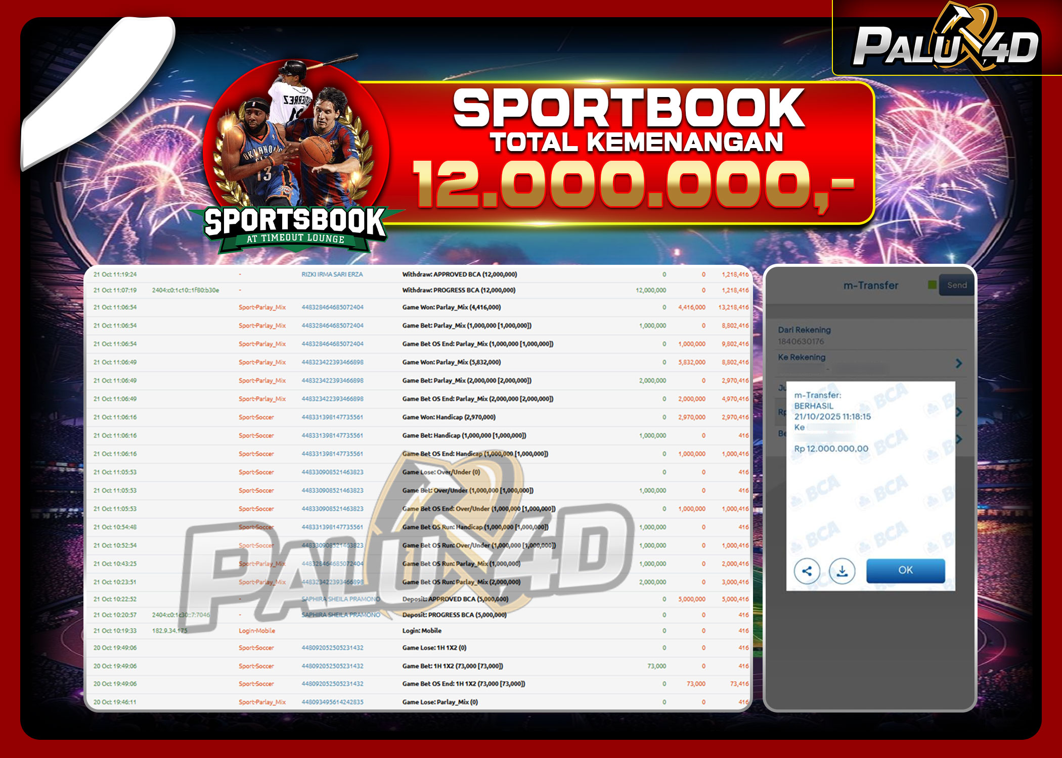 PALU4D – Selamat bagi pemenang yang mendapatkan jackpot hari ini 21 OKTOBER 2025 di game Sportbook TARUHAN BOLA yang di sediakan situs palu4d dan sudah kami bayar lunas. Berikut data pemenang hari ini yang kami proses dengan cepat ke rekening tujuan yang terdaftar di akun selama ±10 menit.