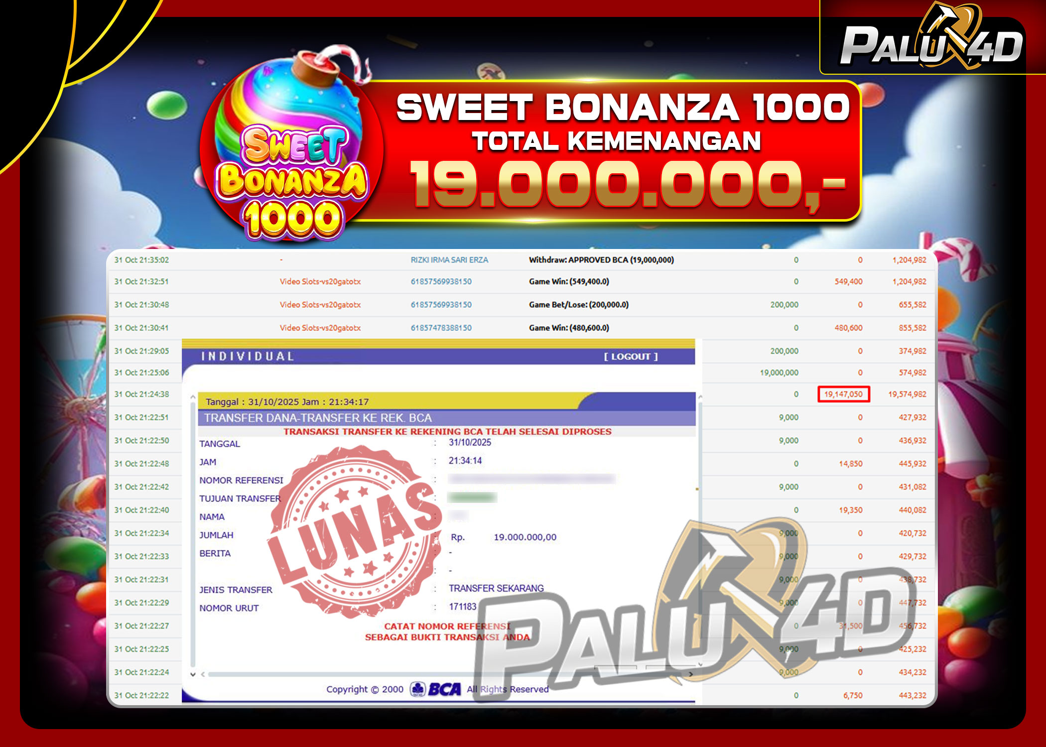 PALU4D – Menang Slot SWEET BONANZA 1000  Rp.19.000.000.,- LUNAS