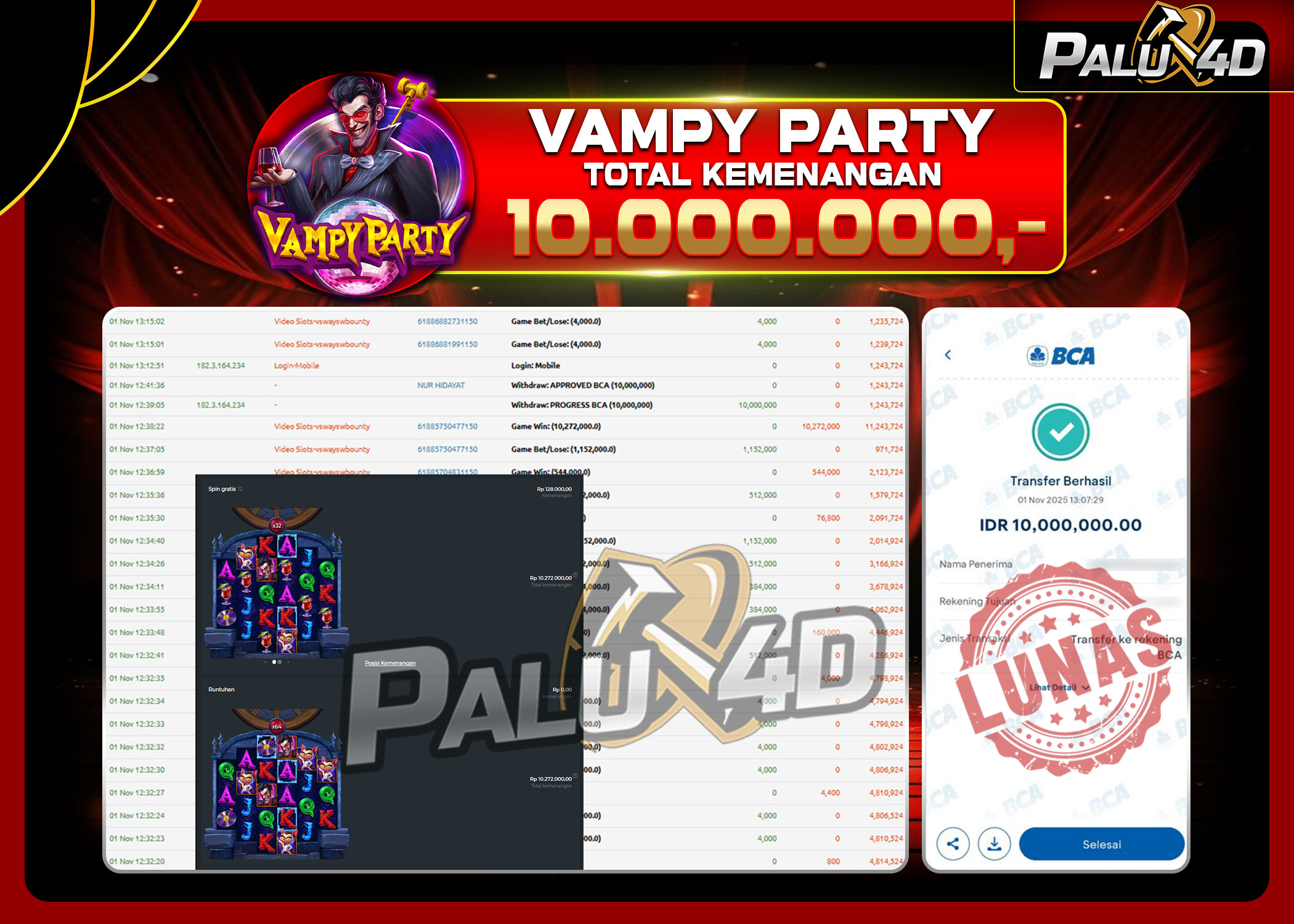 PALU4D – Menang Slot VAMPY PARTY  Rp.10.000.000.,- LUNAS